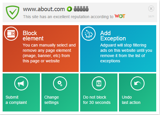 This is Adguard helper icon. It will help to set content filtration right from the browser making the process maximally convenient. So, the user can easily block a separate element, add a site in exceptions (which means no ad blocking for it), complain against any site and more. Adblock Plus for Edge will have analogical functionality. But now salvatory extension is developed for Chrome and Firefox, and you can shift to fully-featured application if you plan to use Microsoft Edge.