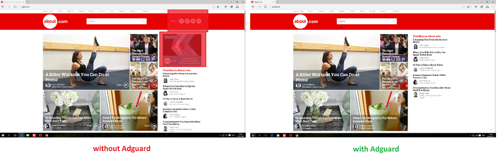 As soon as familiar for lots of users Adblock for Edge launches, it will become possible to test its work efficiency. They say that Edge Adblock is going to use old technologies, so we can promote a fair enough supposition that Adguard will be able to fulfil more effective work. Our tests proved that as of today Adguard indeed protects computer more efficiently then extension based on Chrome or Firefox.