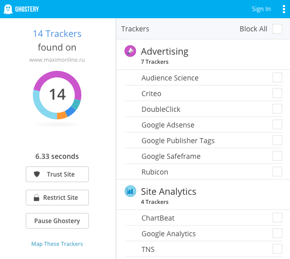 Meanwhile, the popularity of apps and extensions for banning or analyzing advertising tracking slowly grows. One of the most popular products - Ghostery - shows which services are collecting data about the visitor on certain web pages and helps to control it.