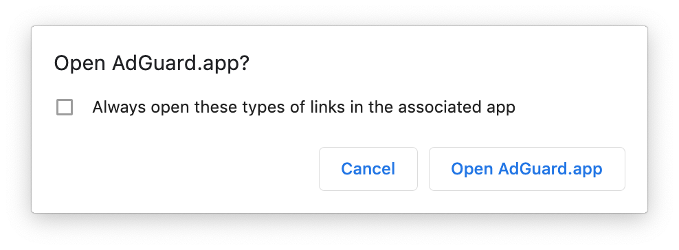 Notice that there's also a checkbox to "Always open these types of links in the associated app". The associated app being AdGuard, of course :)