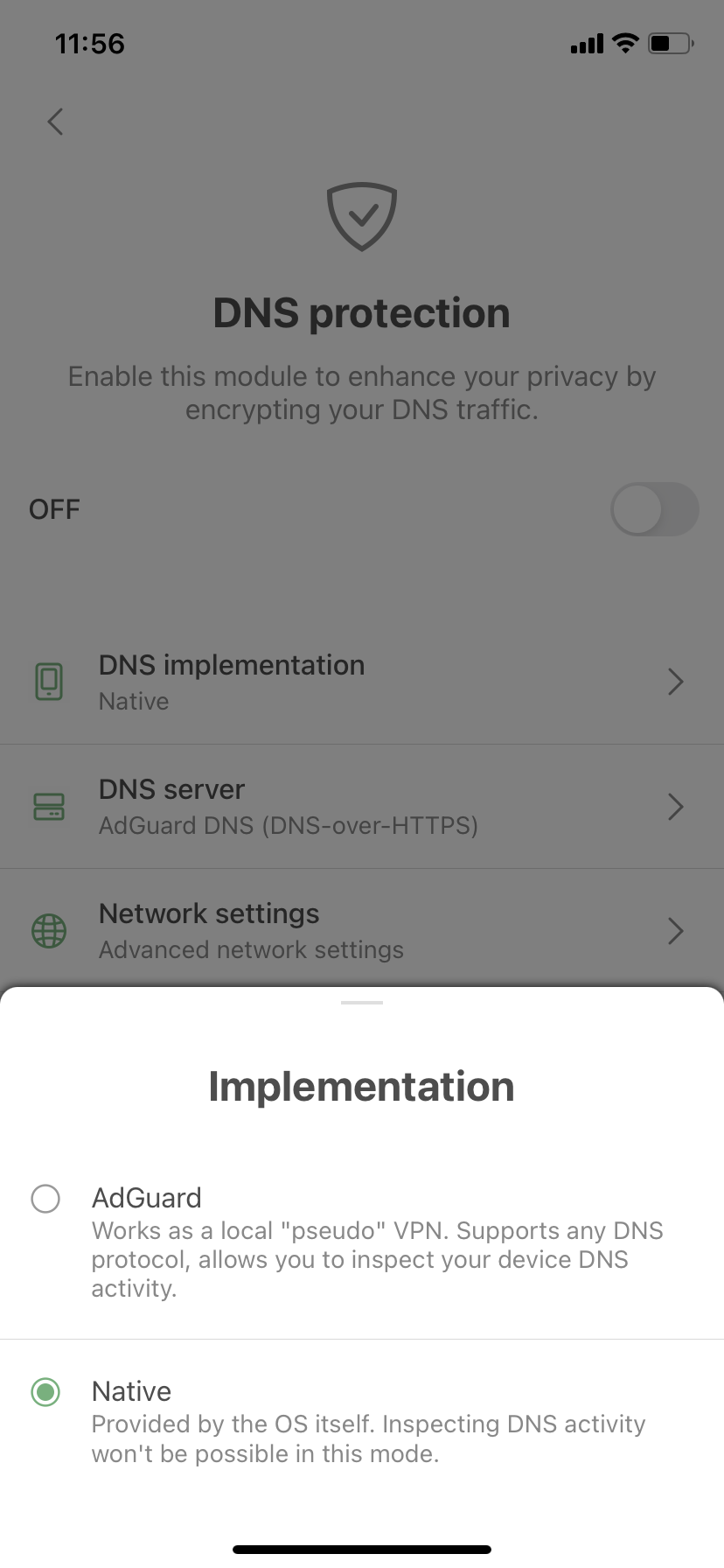 - Open AdGuard Settings > DNS protection > DNS implementation > Switch to Native.