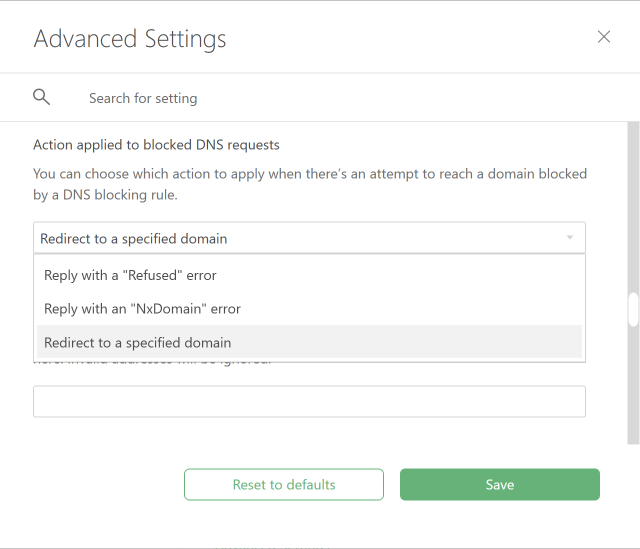 There is a new section named "Action applied to blocked DNS requests" in advanced settings. Now you can select the response type if you’ve requested a DNS domain blocked by a DNS filtering rule. There are three response types to choose from: Reply with a "Refused" error, Reply with an "NxDomain" error, or Redirect to a specified domain. For instance, if the last option is selected, all the blocked DNS requests will be redirected to the IPv4 or IPv6 address specified by the user.