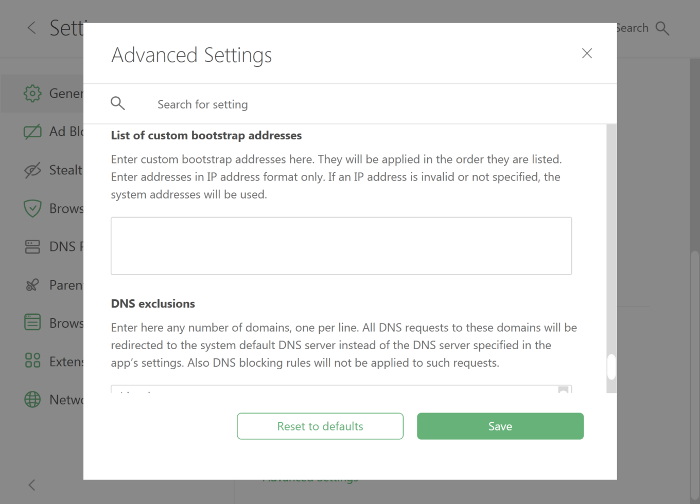 Despite this function being rather for the benefit of advanced-user types, we've improved the advanced DNS settings by adding a bootstrap option. What is a bootstrap at all, you might ask? To put it shortly, it is an intermediate server used to get the IP address of the secure DNS server you previously chose. And you would need such an intermediate while using fancy DNS protocols like DNS-over-TLS, because then the server address would look like words and letters instead of (normally used) numbers — and your system would be at a loss as to how to reach that server. This is where bootstrap comes into play, 'translating' those letters into numbers and giving a destination for the connexion.