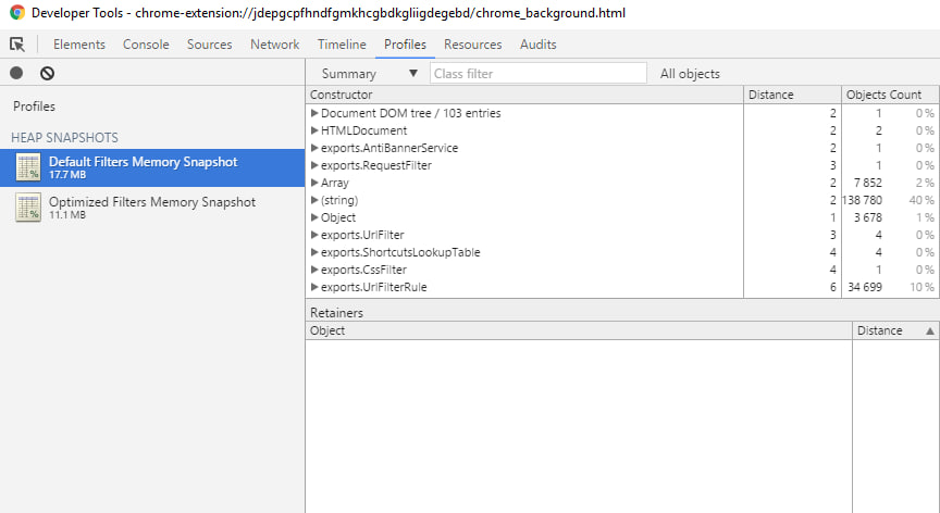 Memory snapshots are made in Chromium. First shows, that AG uses 17.7MB with default filters. Second, that AG uses 11.1MB with “optimized” filters.