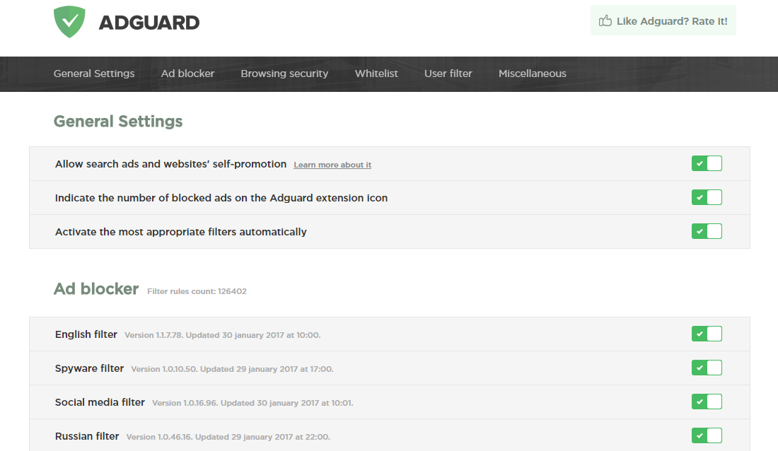 With Adguard for Edge, you can disable ad filtering for any specific website, block any element on the page, and do other useful stuff (that our users already know of).By clicking on "Adguard settings", you can regulate filtering the way you want. Activate filters to select what shall be blocked. Thus, for example, you can enable search ads (which sometimes can be useful), allow protection against spyware and other trackers, remove overload of social buttons (Like, Share and such):