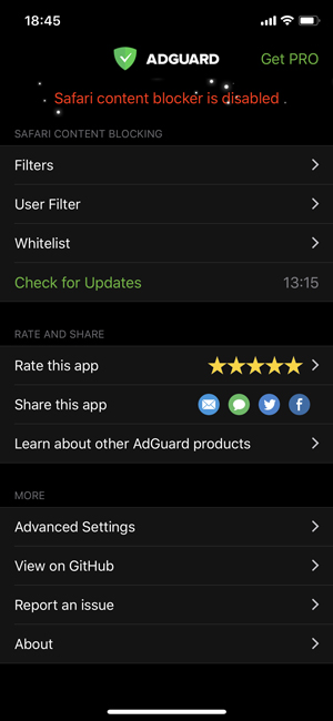 Enabling AdGuard Content blocker in Safari settings is required to have filtering going on in Safari. From now on, if AdGuard is disabled, the red warning will appear at the top of the main screen to remind you to enable the Content blocker. The video right below it shows how to do so (it is hidden on this screenshot, but it will be there on your screen).