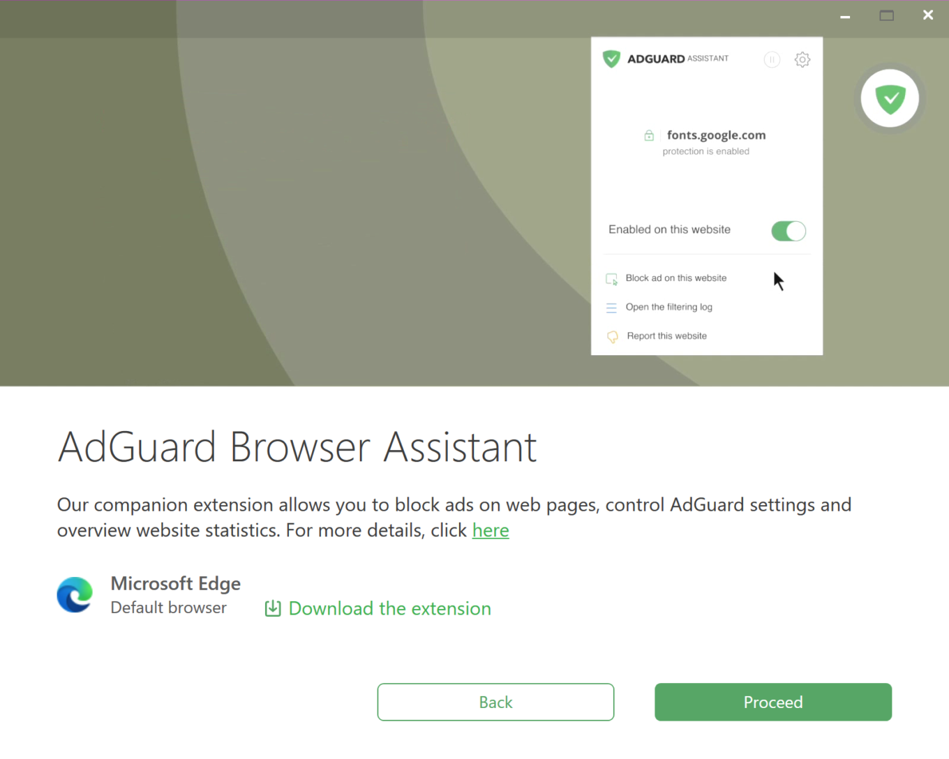 A super important feature for new users. When you install AdGuard for Windows, first thing you'll be met with is the onboarding process: a quick way to learn about AdGuard's many settings and to customize filtering to your preferences. Browser Assistant also has a place in it now: AdGuard will determine your default browser and prompt you with a download link for the new Assistant. And in the rare case when your browser is not compatible with it, you will be offered to install our legacy Assistant instead.