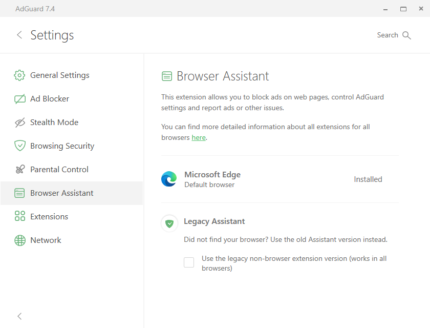 Of course, the new Assistant requires its own tab in the app's settings. It's quite minimalistic: you'll find there an option to install Browser Assistant for your default browser if you missed the opportunity during the onboarding. It also has a checkbox to enable the legacy Assistant (useful in cases if your browser of choice is quite rare and is not supported).
