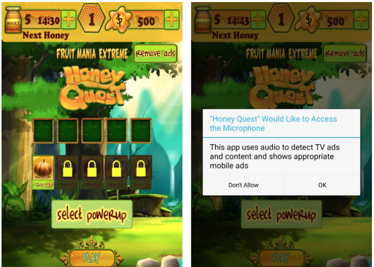 There are more than 1000 game apps in Google Play that include software for detecting TV ads. Once installed, an app uses a smartphone’s microphone to identify audio signals in TV ads and shows, even when the game is not played, and the phone lies still in the owner’s pocket.