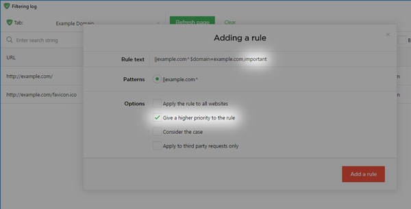 This one is a rather obvious: when you create a new custom rule via the Filtering log, you can now give this rule a higher priority by ticking the respective checkbox. The $important modifier was available before, but you had to manually add it via the user filter.