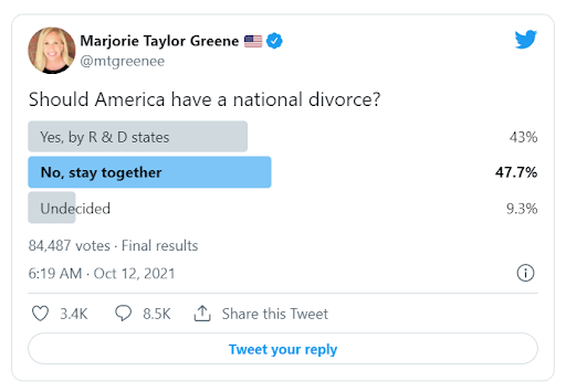 Facebook is being blamed for no less than "national divorce", a fatal splitting of the US in uneven halves. This can happen, according to the results of a recent Twitter poll posted by Rep. Marjorie Taylor Greene.