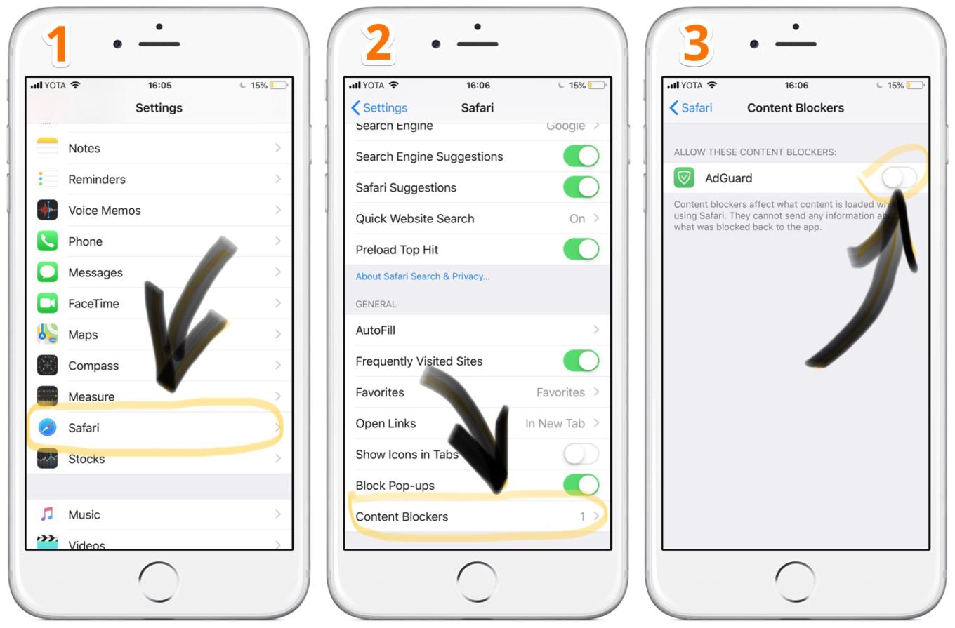 STEP 2: Go to iOS device's Settings and Enable Safari Content blocker setting for AdGuard