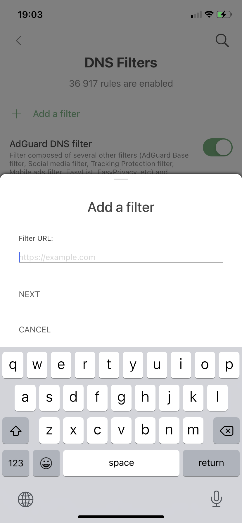 2. Open AdGuard for iOS settings —> DNS protection —> DNS filtering (available when Advanced mode is enabled) —> DNS filters.