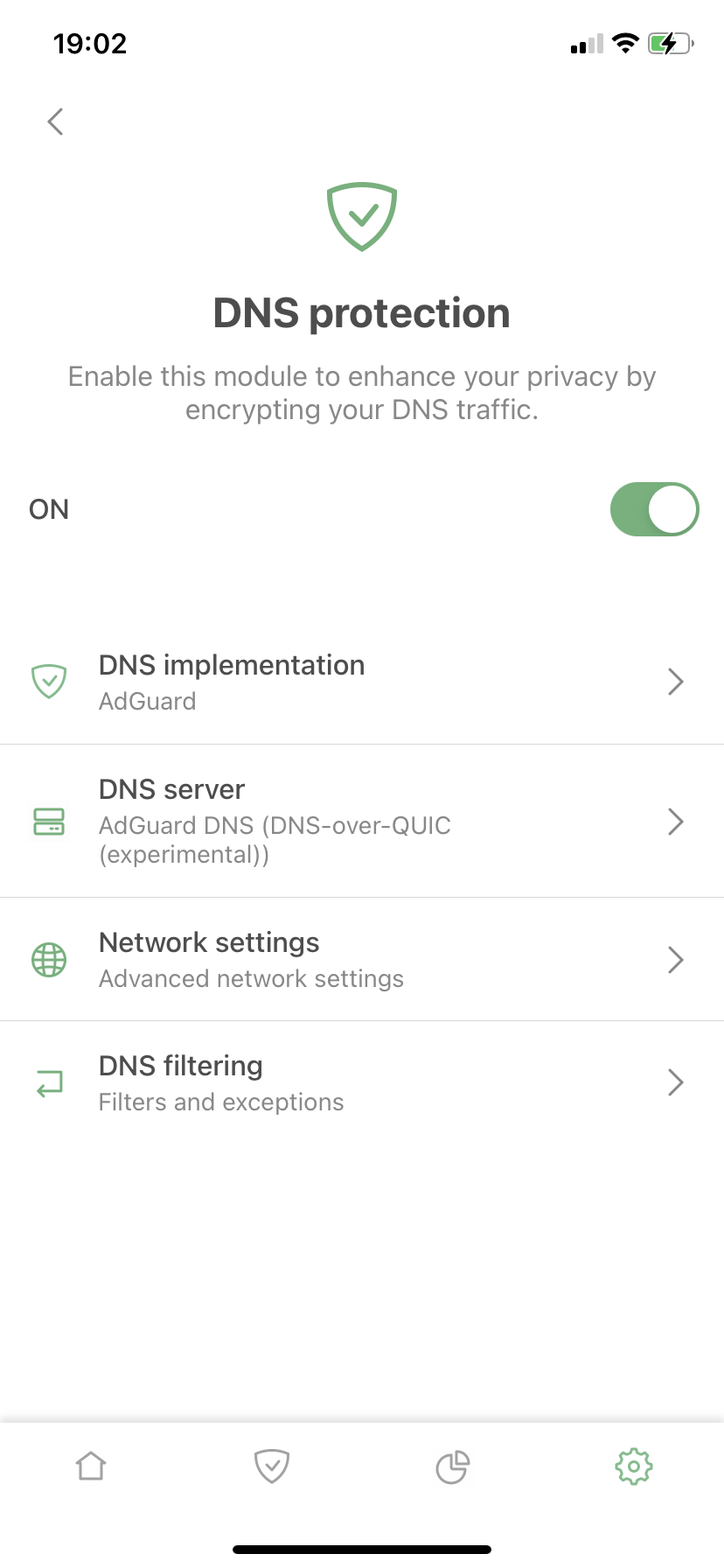 Actually, DNS protection is the same thing as system-wide protection, these terms are synonymous and interchangeable. To enable it, open AdGuard for iOS settings —> DNS protection. Switch it on. And that's it!