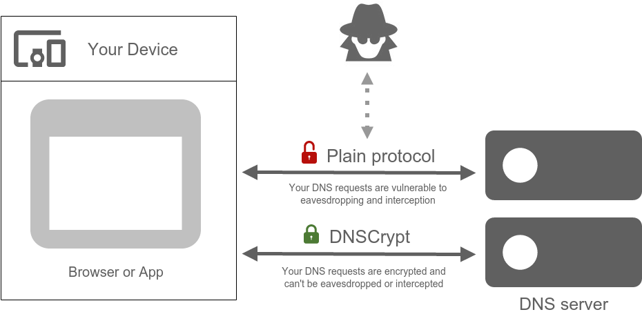 If you use regular plain DNS protocol, you are at risk of your DNS requests being intercepted and, subsequently, eavesdropped and/or altered. The experiments show that the DNS tracking can even be used to construct a 'profile of interests' for any user. AdGuard is able to use DNSCrypt - a special protocol that encrypts communication with the DNS server, thus preventing tampering and tracking by any third party including your ISP.