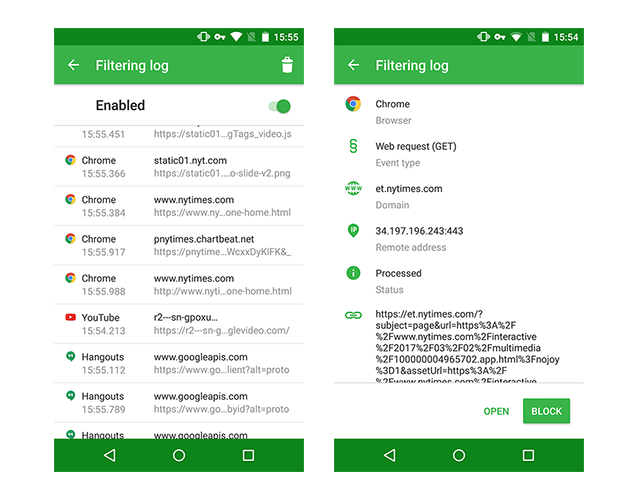 This feature appeared in AdGuard for Android 2.9 and made your life easier. There you can have a complete control of what is going on on your device. In the Filtering log you can manage the access for requests, e.g. block them. You can also check the requests and see whether they are safe.