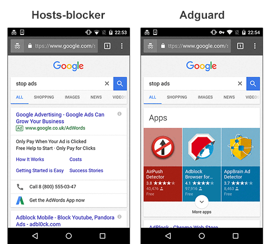 Unlike many other other ad blockers, AdGuard is not just a "hosts" blocker, but a full-fledged "filter" that passes through itself traffic of all apps, and then decides what to do with it. These decisions are based on the set of special rules. For example, in the picture below you can see that AdGuard (right side) is capable of eliminating the ad which is impossible to block without applying cosmetic rules.