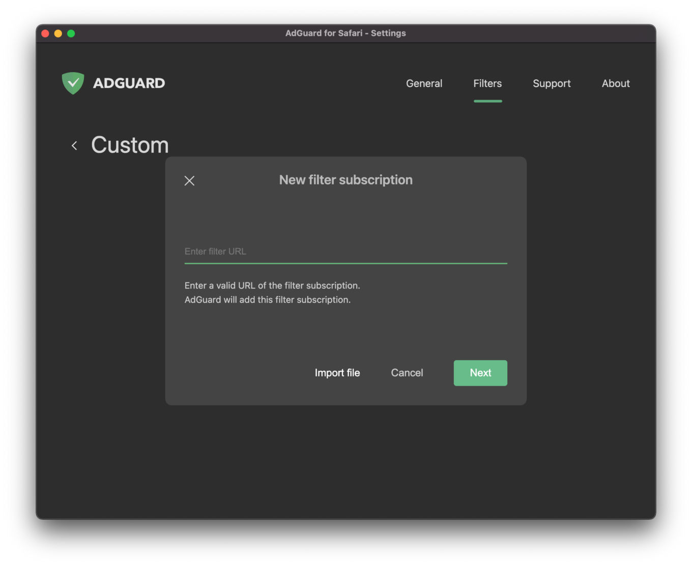 AdGuard Custom is extra space left for supplementary filters you may want to add. Adding a filter is not rocket science. There is no need to know how to create user rules, you can use the ready-made filters. Just enter a valid URL of the filter subscription in the field, and voila.