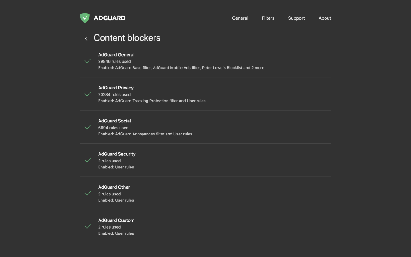In the Filters tab you can enable/disable the whole category, or fine-tune separate filters inside it. If you make changes, this would be reflected in the Content Blockers section (located in the General tab). In other words, you can adjust things in the Filters tab and see what has changed in the Content Blockers section.
