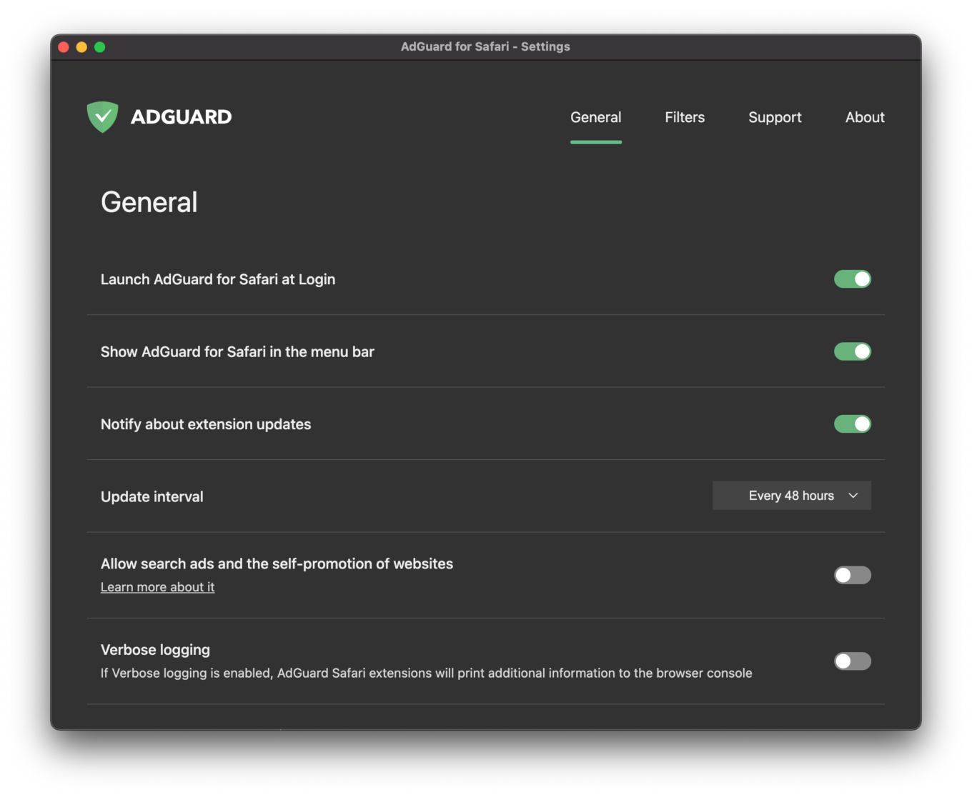 The first tab is the General screen where you can set up basic things like notifications, update intervals, and launching AdGuard at system startup. You can also choose to display the AG icon in the menu bar – a nice option for minimalists, we’d say. And most importantly, you can choose which content blockers you’re going to use, but more on that later.