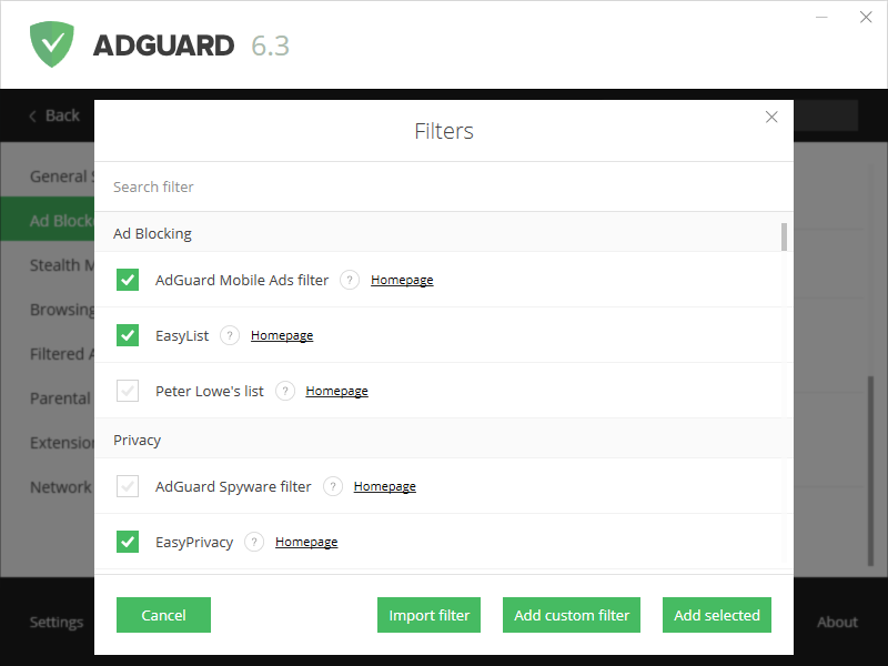 AdGuard team develops and supports a range of own filters, but you also have an option to choose any from dozens of third-party filters available by default, or even add your own (we'll talk about it a bit later). In the Ad Blocker settings you can enable and disable any filters as you see fit.