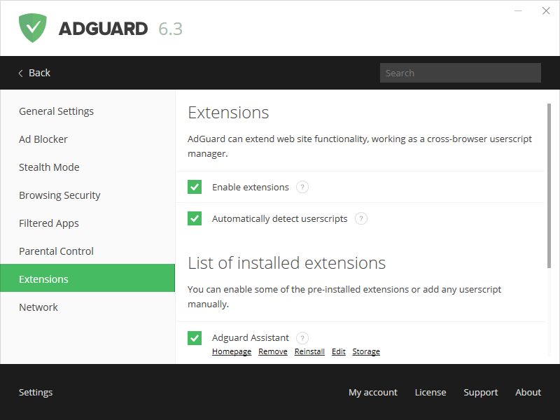 One of the important features of AdGuard for Windows is that the application can work as a cross-browser userscript manager. You can easily add any scripts you like and manage the existing ones. At the same time, AdGuard, as a userscript manager, has several significant advantages: