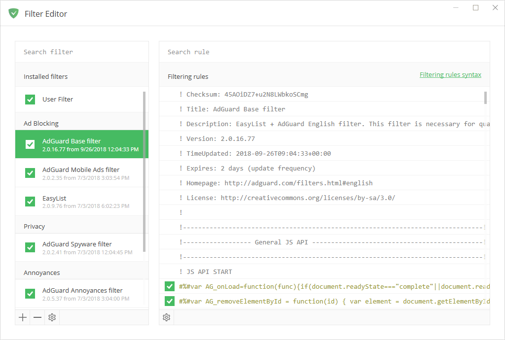 It is a popular opinion that AdGuard uses magic to block ads, but it is, in fact, not true. Ad blocking is possible thanks to filters, which make up the "core" of ad blocker. Filters, in their turn, consist of lists of rules written in special syntax. These rules tell ad blocker what exactly and how to block.