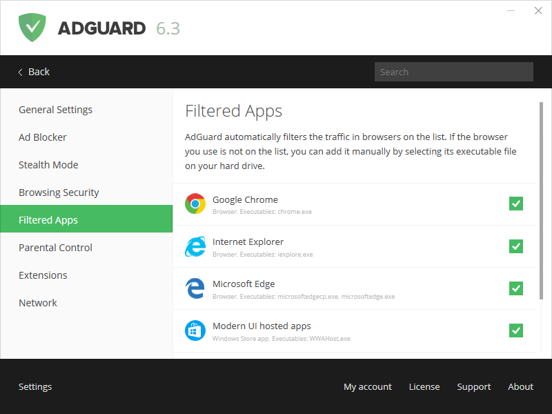One of the obvious advantages of AdGuard for Windows is that it blocks ads in all browsers. But did you know that it can also block ads and tracking in other apps? "Filtered Apps" section contains the list of almost all known browsers and some apps — all of them will be filtered by default. You can also add an executable (.exe) file of any other app to filter it too.
