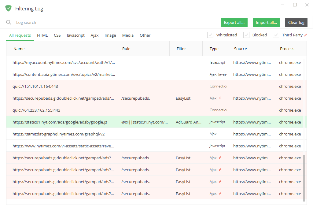 In the Filtering Log are displayed all web requests that go through AdGuard. For your convenience they are highlighted with different colors (for example, blocked requests are highlighted with red). This way, it's very easy to track what's been blocked and what's not. Filtering Log is essential to create your own rules and mostly exists to help advanced users.