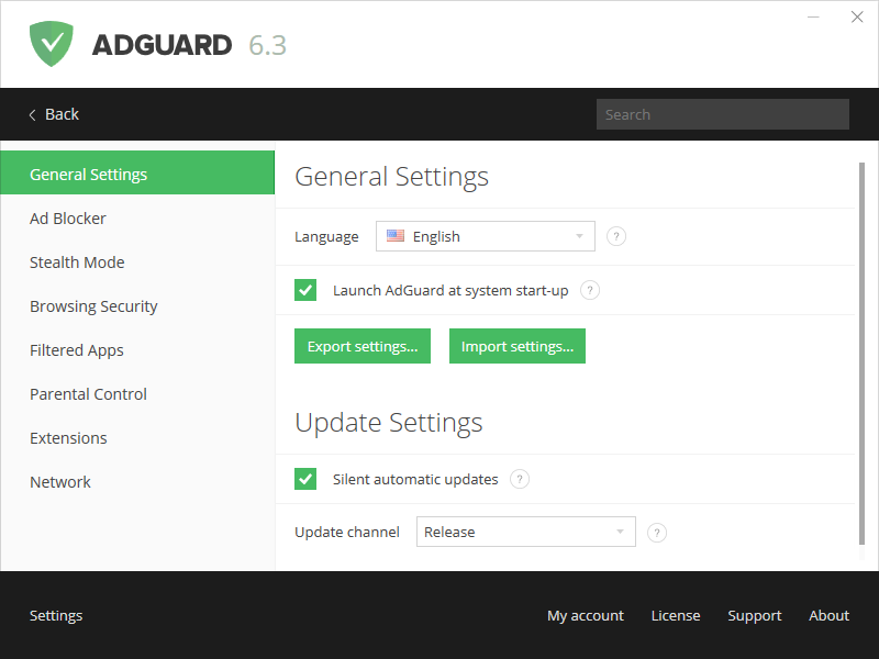 Here you can choose the app language, export or import AdGuard settings (for a faster switch between the settings profiles or to transfer your profile between the different computers), and also select an update channel, i.e. a mode in which the application receives its updates.