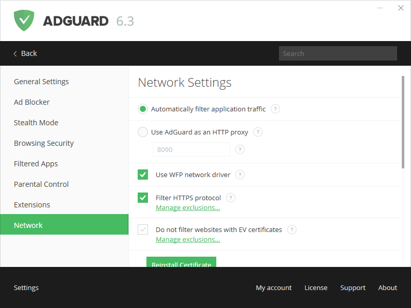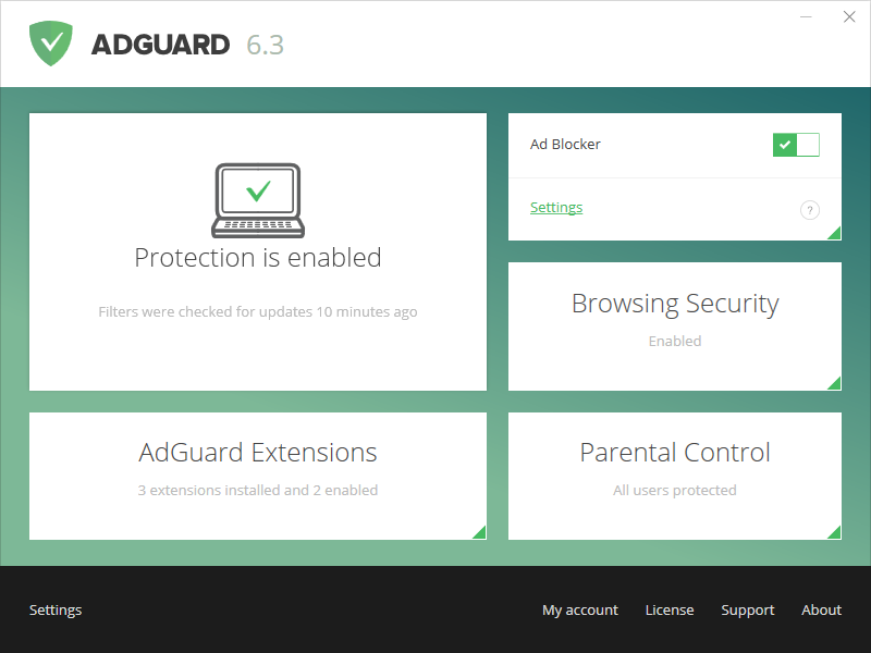 All AdGuard for Windows functions can be roughly divided into several groups (which correspond with items from AdGuard's settings menu):