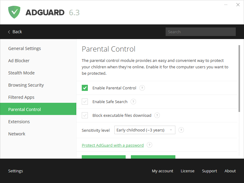 You can activate Safe Search, which will exclude adults websites and other inappropriate content from search results on all popular search engines such as Google, Bing and Yandex. You can also prohibit the loading of executable (.exe) files, this will prevent your kids from installing any potentially dangerous programs.