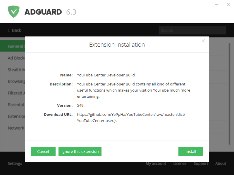 - AdGuard will automatically detect any running scripts and suggest you to install them (in case the Automatically detect userscripts option is enabled)