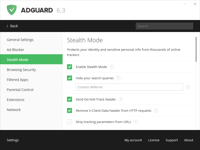 The Stealth Mode module protects your personal data from numerous online trackers and analytical systems. On the screenshots of Ad Blocker you probably noticed the Spyware Filter. This filter is generally enough to protect yourself from online surveillance. However, the Stealth Mode module significantly expands the possibilities and takes your online privacy to a new level.