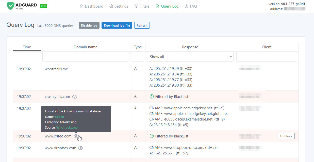 In the next tab there is a query log that offers everything you would expect from it — complete information on each and every request, all kinds of sorting. For each blocked request, there is a small tooltip telling you what rule it was filtered by, additional information about its origin and an "Unblock" button right next to it. Similarly, for unblocked requests there is a "Block" button. The log keeps track of the last 5000 queries and, of course, you can download the log file.