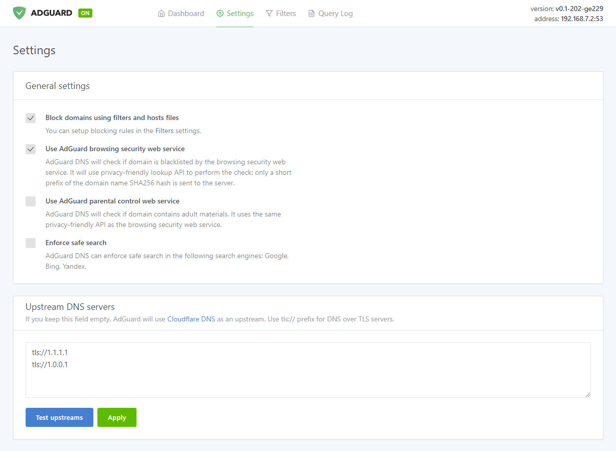 At the bottom of the "Settings" tab is a window to select a preferable upstream DNS server. Don't bother yourself with it unless you know what it means — this option is not essential to the quality filtering at all, but rather is a nice bonus.