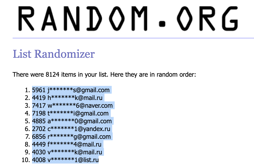 And here is a video proof, of course. We have indeed randomly chosen the 10 winners. All fair and square, as usual.