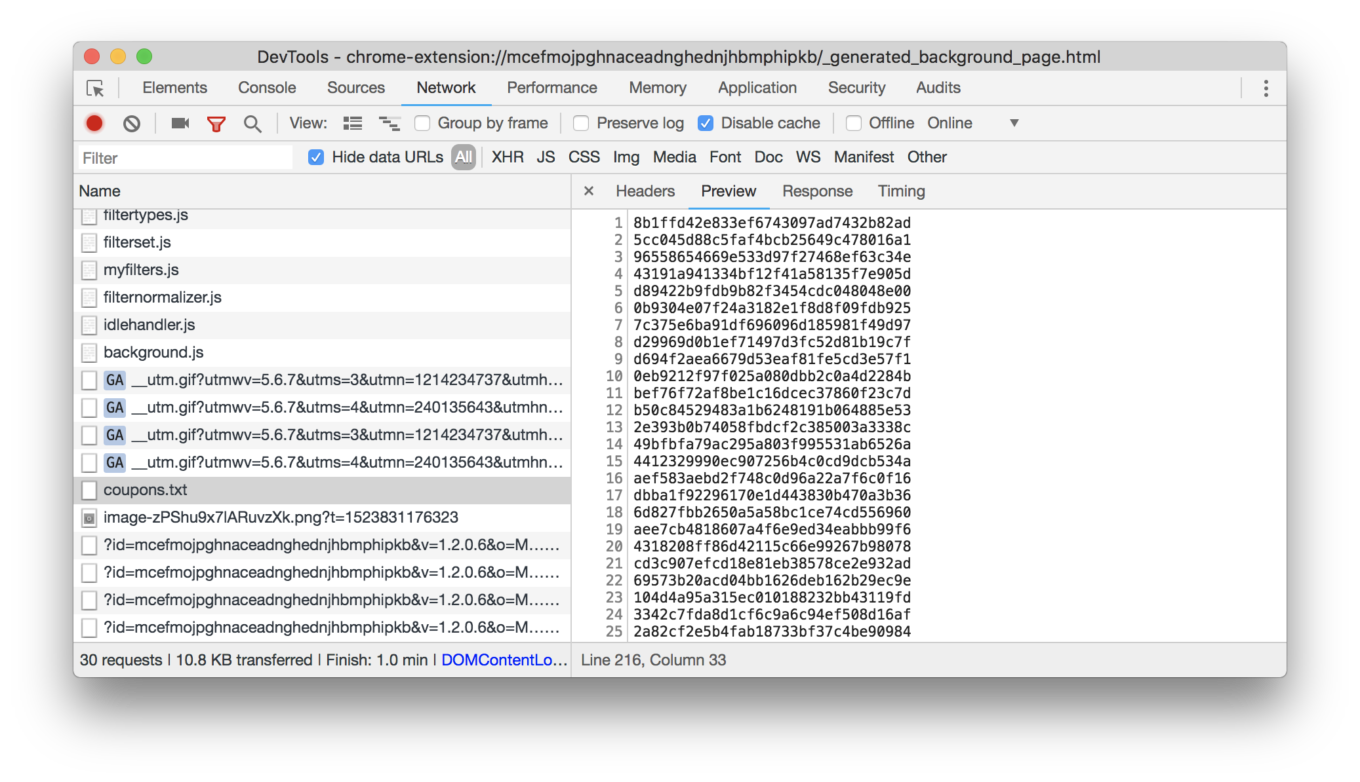 This hidden script was listening to every request made by your browser and compared md5(url + "%Ujy%BNY0O") with the list of signatures loaded from coupons.txt. When the said signature was hit, it loaded an iframe from the g.qyz.sx domain passing information about the visited page, and then re-initialized the extension. For instance, one of these signatures corresponded to https://www.google.com/.