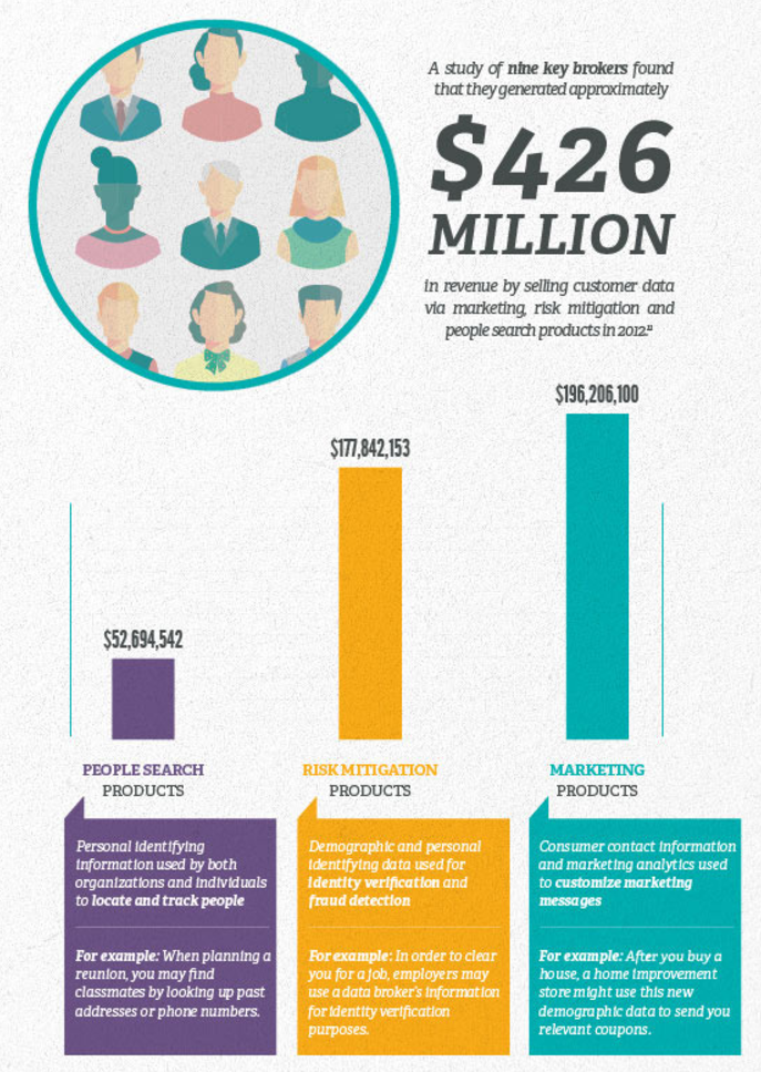The research of the business of data brokers by MBA@UNC gives us a sum of $426 million in the year 2012. We can only imagine how this sum grew over the period of the next five years.