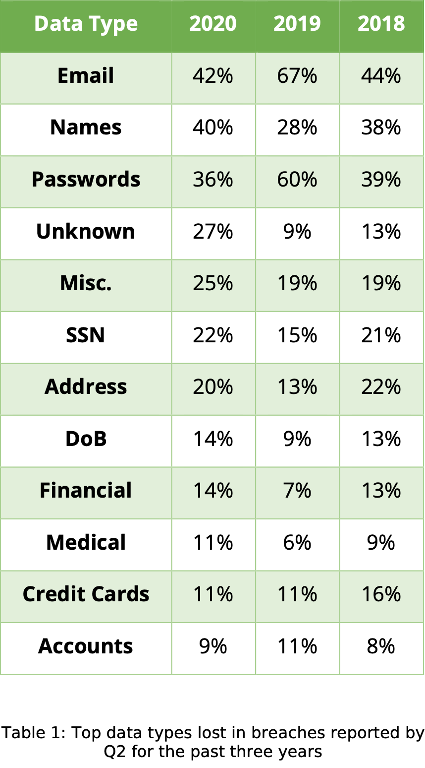 the 2020 MidYear Data Breach Report by Cyber Risk Analytics, ‘the number of payment card details exposed in the first six months of 2020 surpassed 90 million records’. The report covers different breach types: ‘Hack’, ‘Virus’, ‘Web’, ‘Skimming’, and ‘Unknown’. Some breaches include ransomware as an element of the attack, and some ransomware attacks begin with phishing for access credentials.