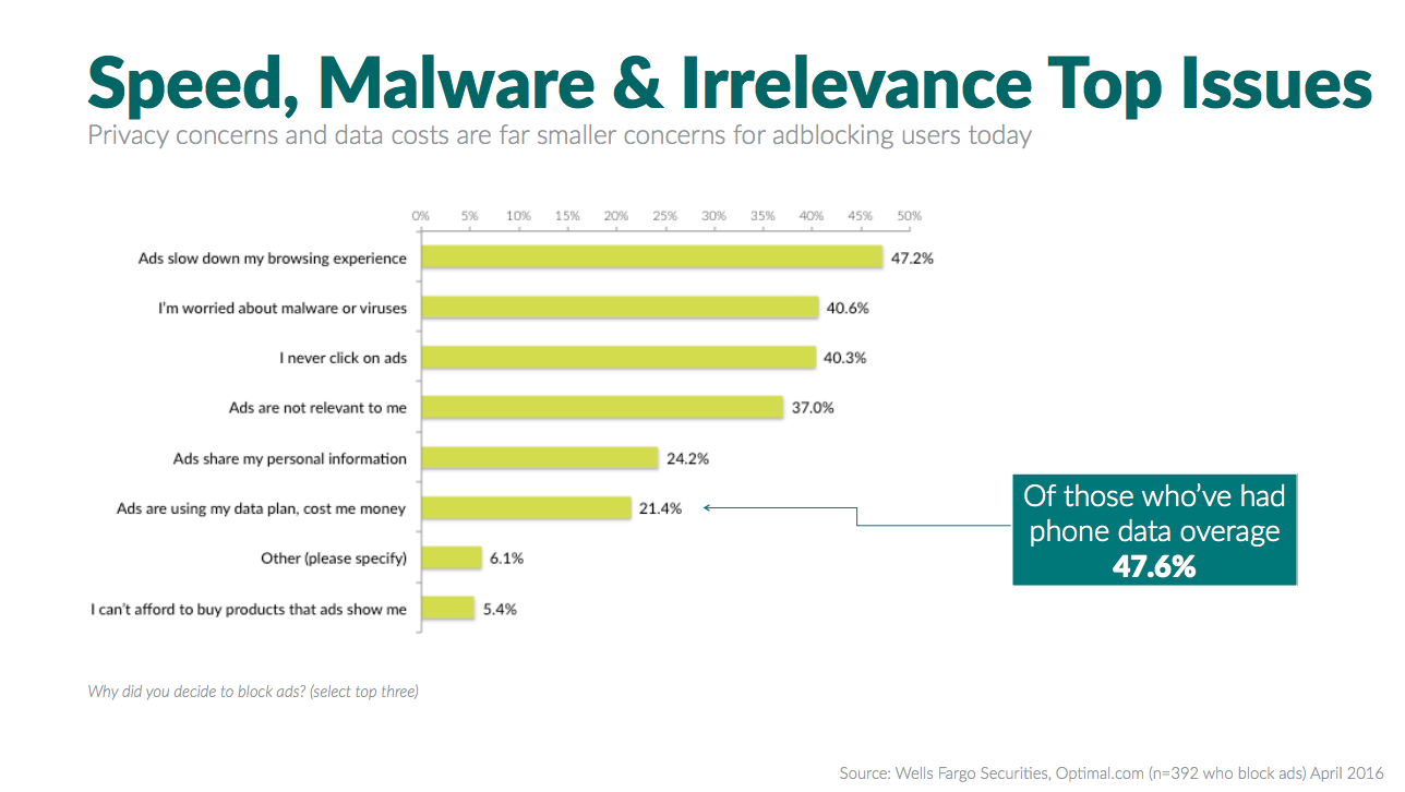 The recent Business Insider article reports about an interesting survey from Wells Fargo Securities and Optimal.com. Optimal asked 1712 smartphone users what they think of ad blocking. Out of 1320 people (who do not block ads) 45.6% reported that they were not aware they can do it.